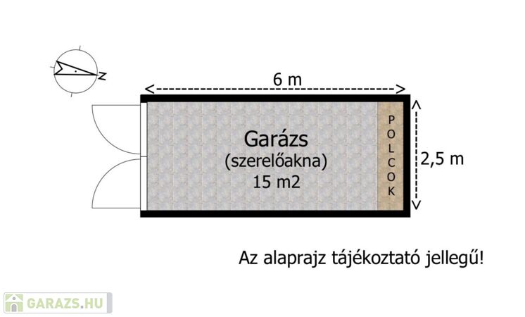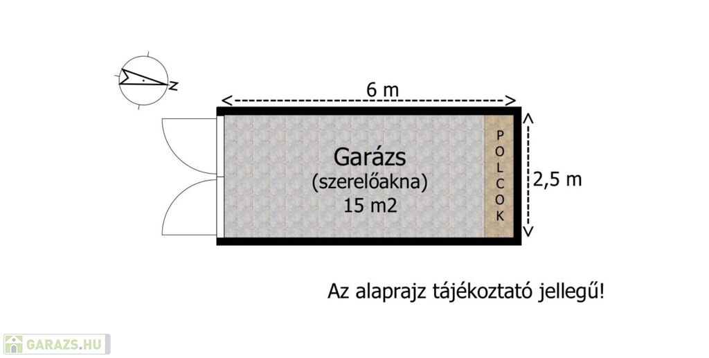 A garázs belső végében teljes szélességben kiépített polc, szekrény található a szerszámok, ritkábban használt dolgok tárolásához.